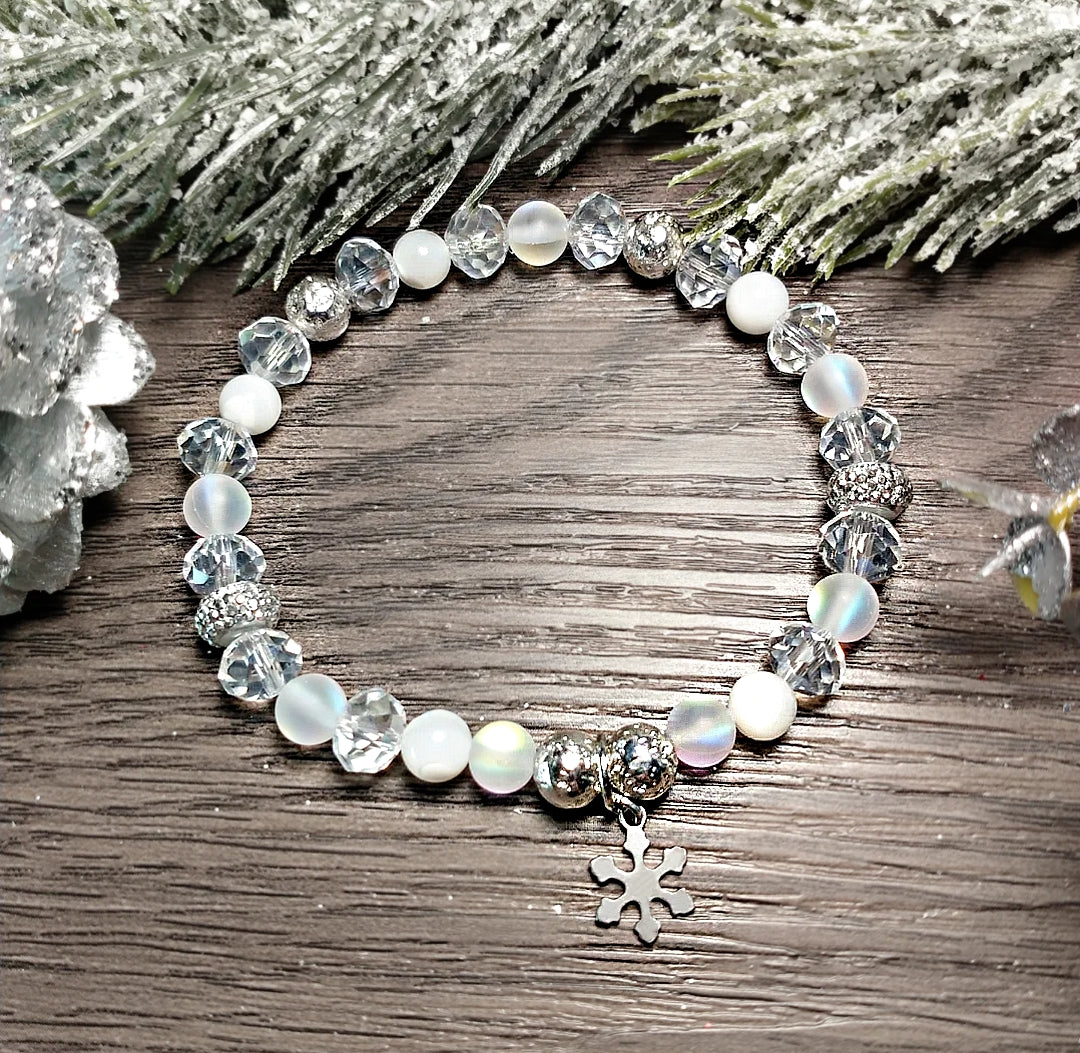 Découvrez le bracelet "Neige", une création élégante et lumineuse inspirée de la douceur hivernale. Il est composé de pierres d’hématite, de nacre aux reflets délicats, ainsi que de billes en pierre de lune synthétique de 6 mm, choisies pour leur éclat doux et apaisant. De fines billes en verre de cristal, des rondelles de zircon scintillantes et une breloque flocon en acier inoxydable complètent harmonieusement ce bijou, lui donnant une touche magique et raffinée.