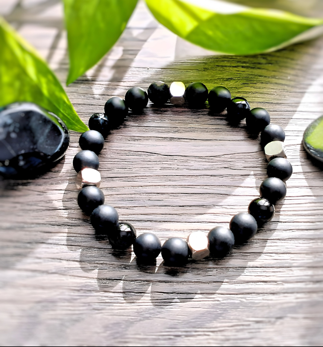 Voici le bracelet "Ashton", composé de pierre d'onyx mat et lustré de 8 mm. Il est décoré d'insertions à facettes carré en acier inoxydable. Ce bracelet est un véritable passe partout, il s'harmonise bien avec tout les styles vestimentaires.