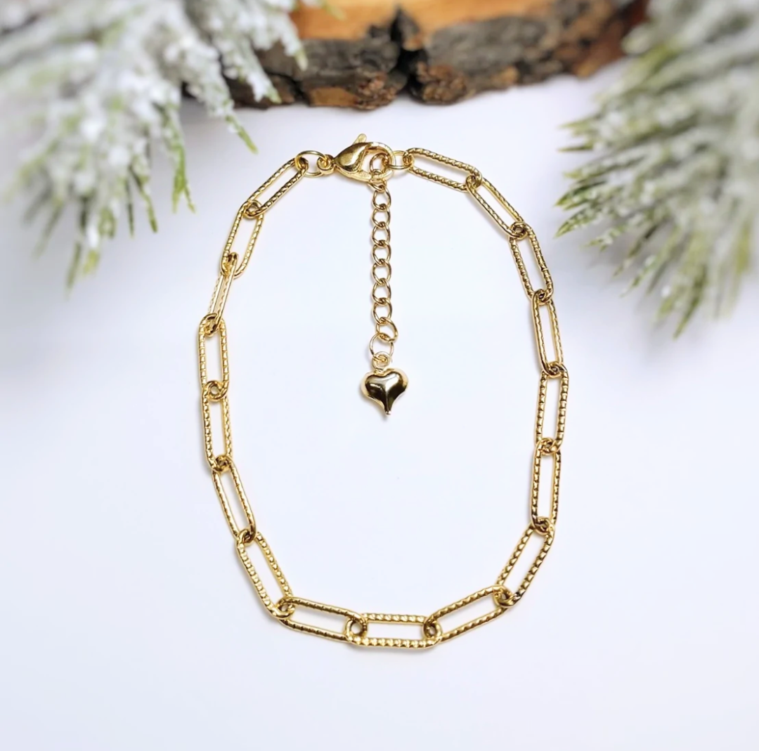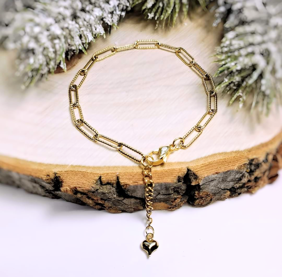 Voici le beau bracelet "Rare", fait d'une chaîne à maillons, (one size, il est ajustable avec une rallonge) et une breloque en forme de coeur, tous en acier inoxydable hypoallergénique.