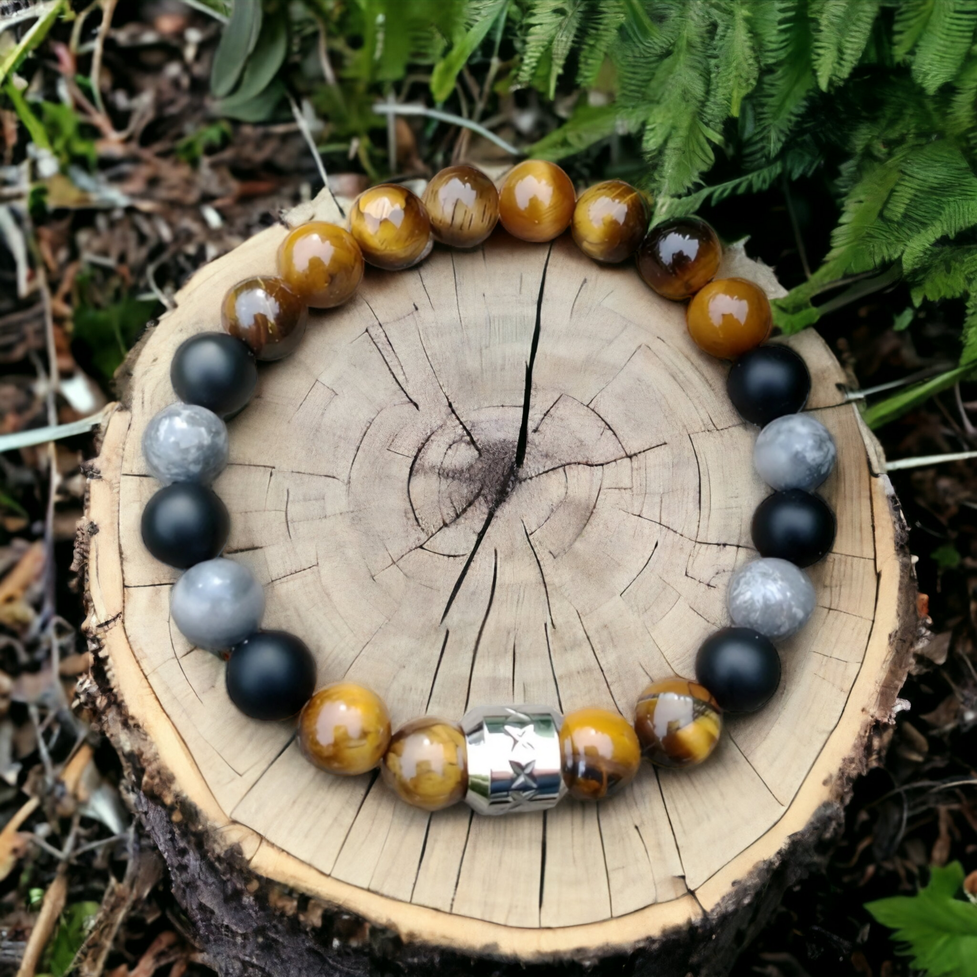 Voici le beau bracelet "Orlando", composé de jaspe, oeil de tigre Amarillo et onyx mat 8 mm. Il est décoré d'un tube espaceur de 10 mm, en acier inoxydable.