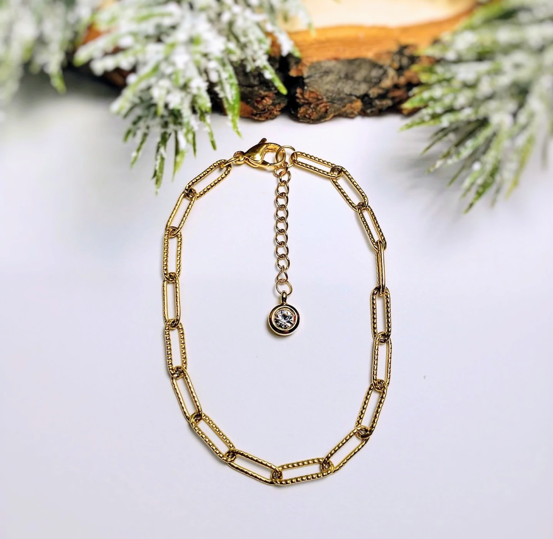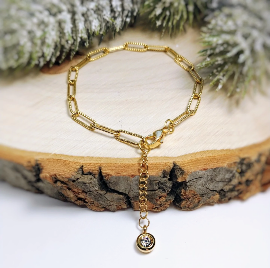 Voici le beau bracelet "Sensationnel", fait d'une chaîne à maillons, (one size, il est ajustable avec une rallonge) et une breloque en pierre du rhin, tous en acier inoxydable hypoallergénique.
