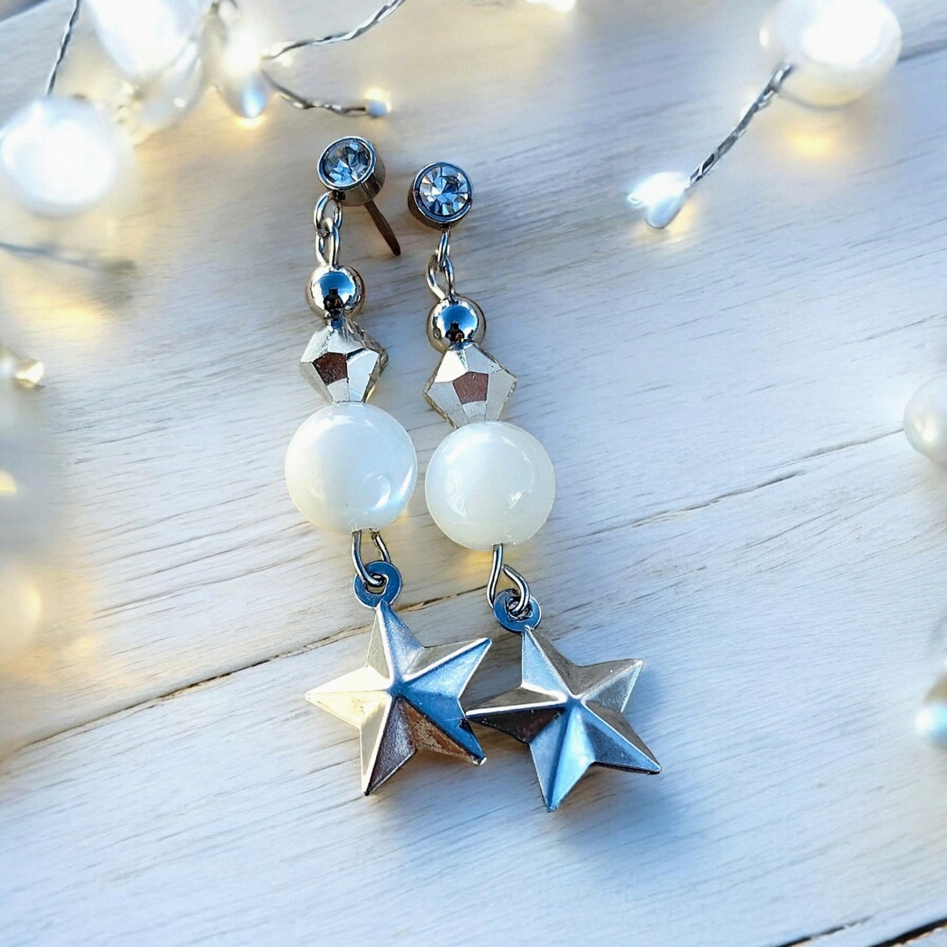 Voici les jolies boucles d'oreilles "Silent night", composées de crochets en acier inoxydable hypoallergénique. Elles sont décorées de cristal tchèque Preciosa argentés 6 mm, d'une perle de nacre 8 mm, zircon transparent et une breloque en forme d'étoile, en acier inoxydable.