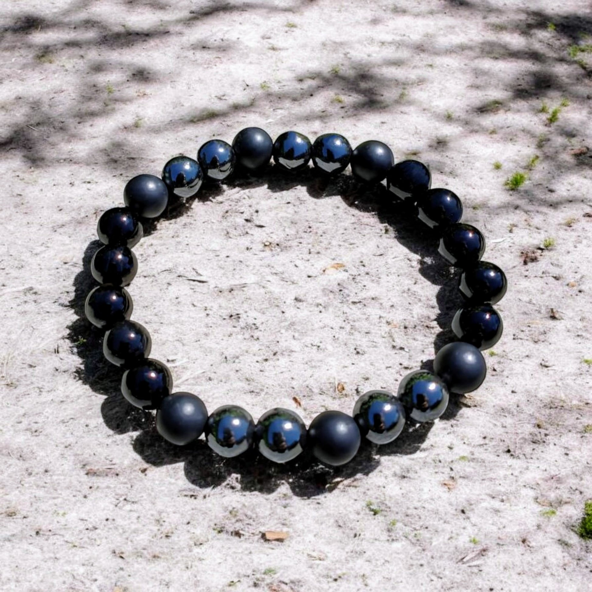 Voici le beau bracelet "Cruz", composé de pierre d'hématite noire, d'onyx lustré & onyx mat de 8 mm. Élégant et neutre, il s'harmonise bien avec tout les styles vestimentaires.