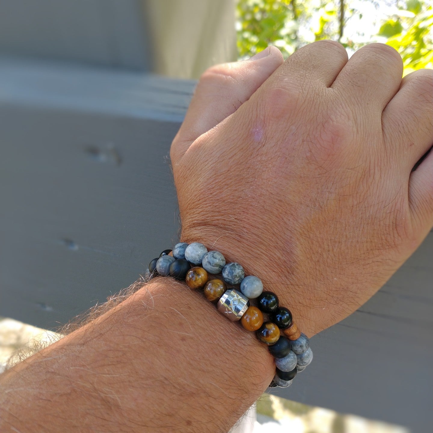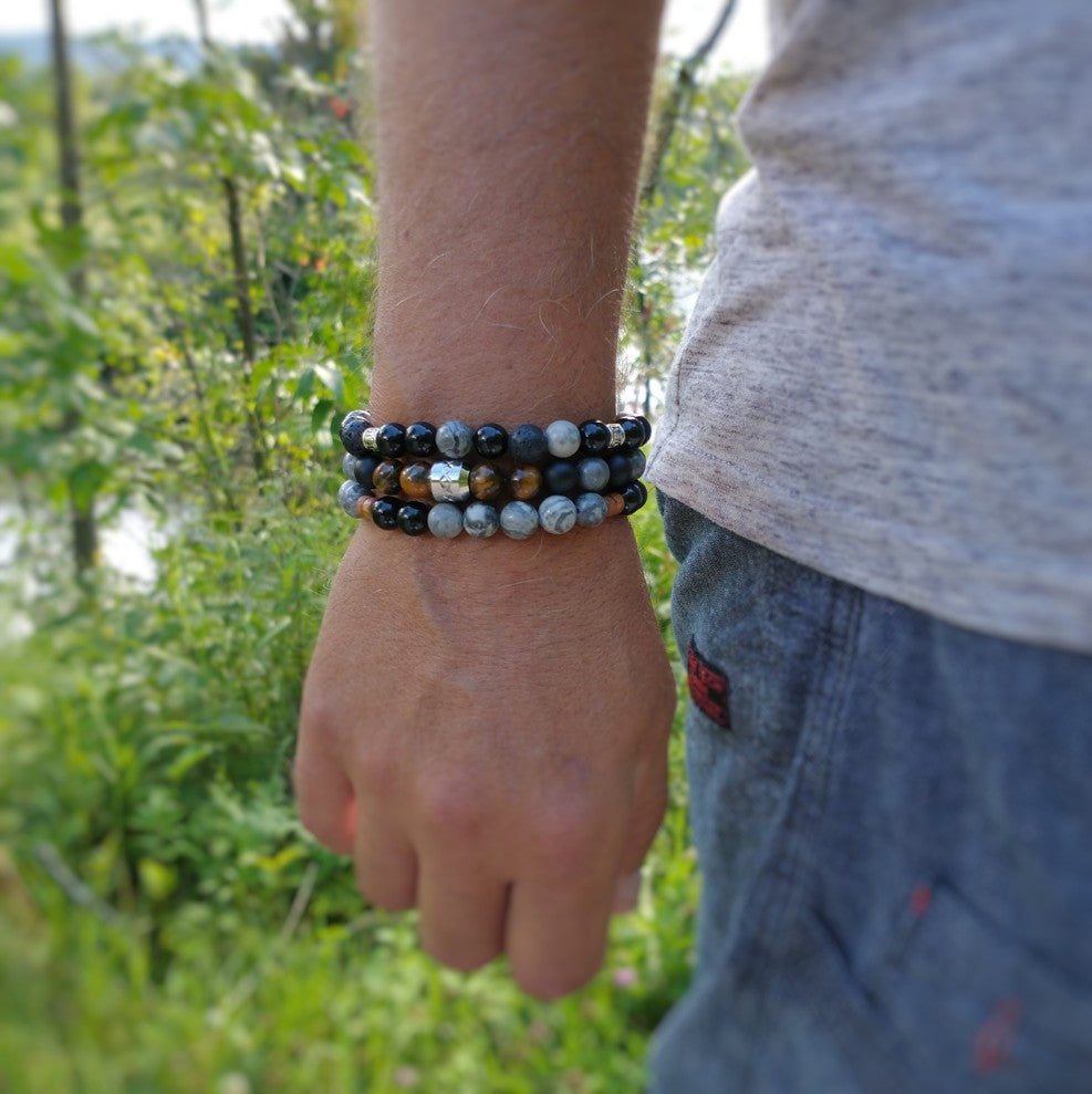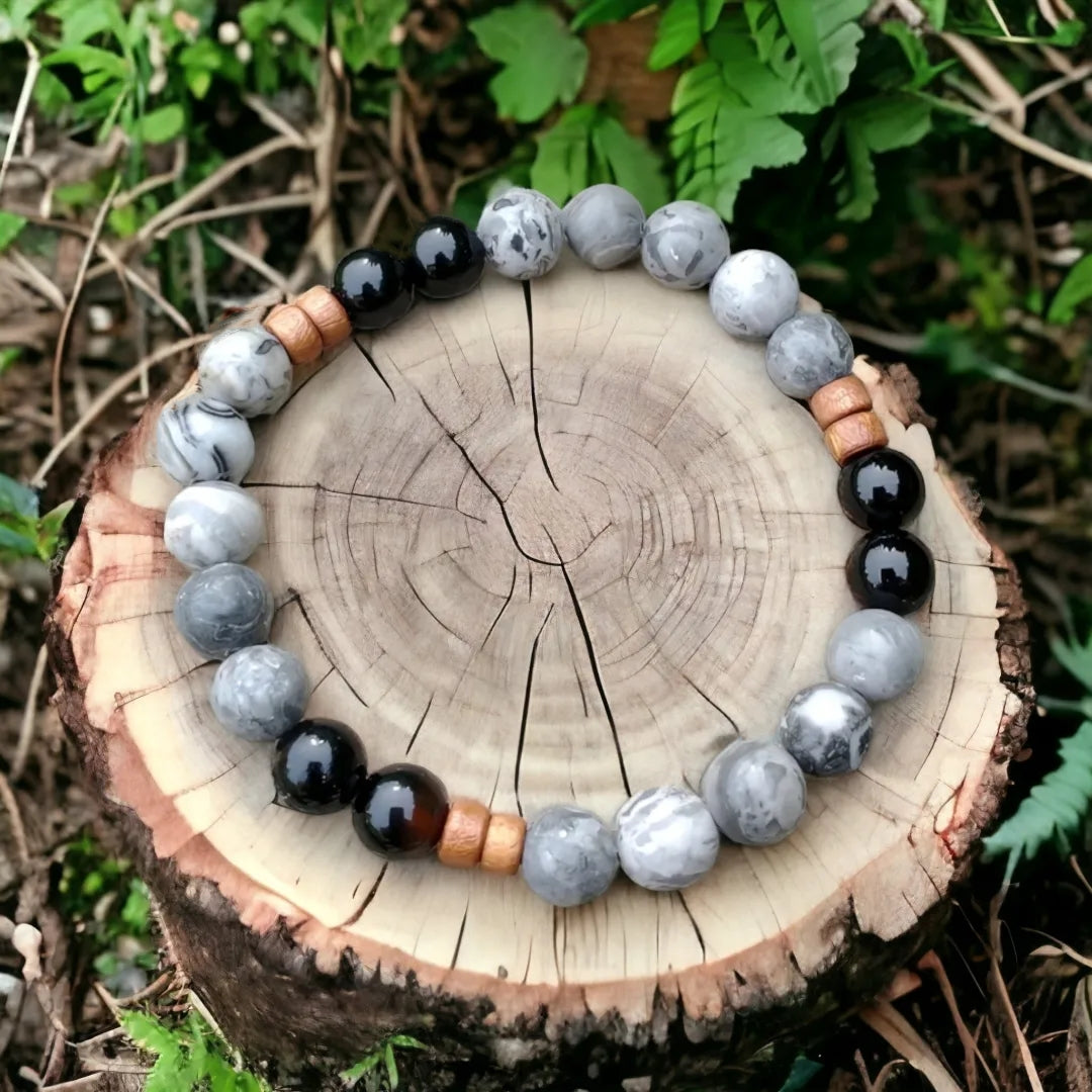 Voici le magnifique bracelet "Taylor", composé de pierres de jaspe et d'onyx de 8 mm ainsi que de belles rondelles en bois.