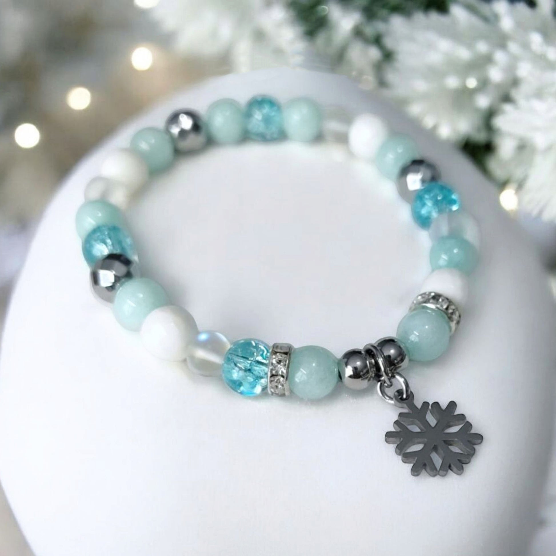 Laissez-vous envoûter par la douce magie hivernale avec ce bracelet raffiné, composé de pierre de lune synthétique, agate, amazonite, hématite à facettes et quartz craquelé. Ses rondelles scintillantes de zircon et sa breloque flocon de neige en acier inoxydable évoquent la beauté cristalline des paysages enneigés.