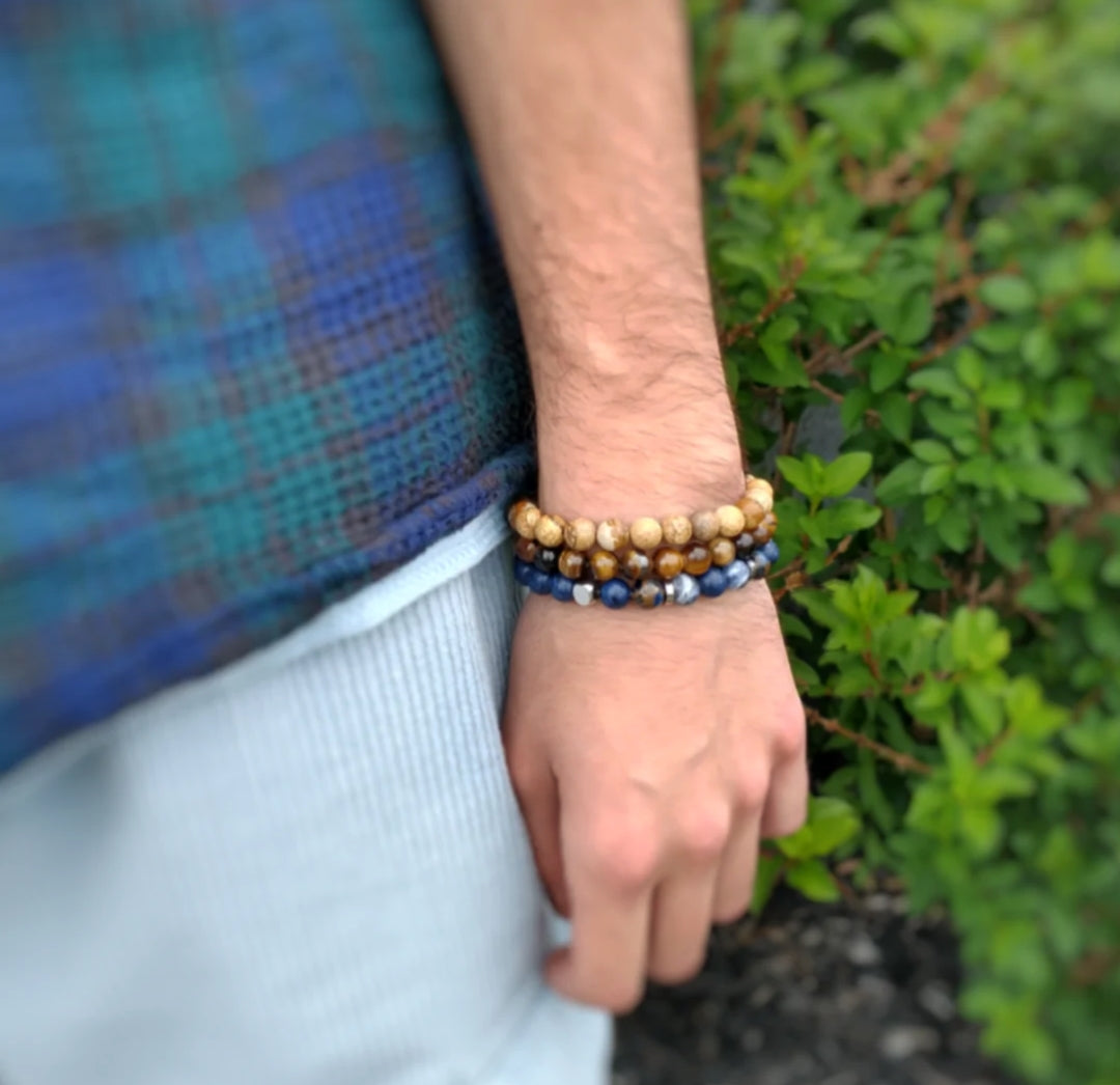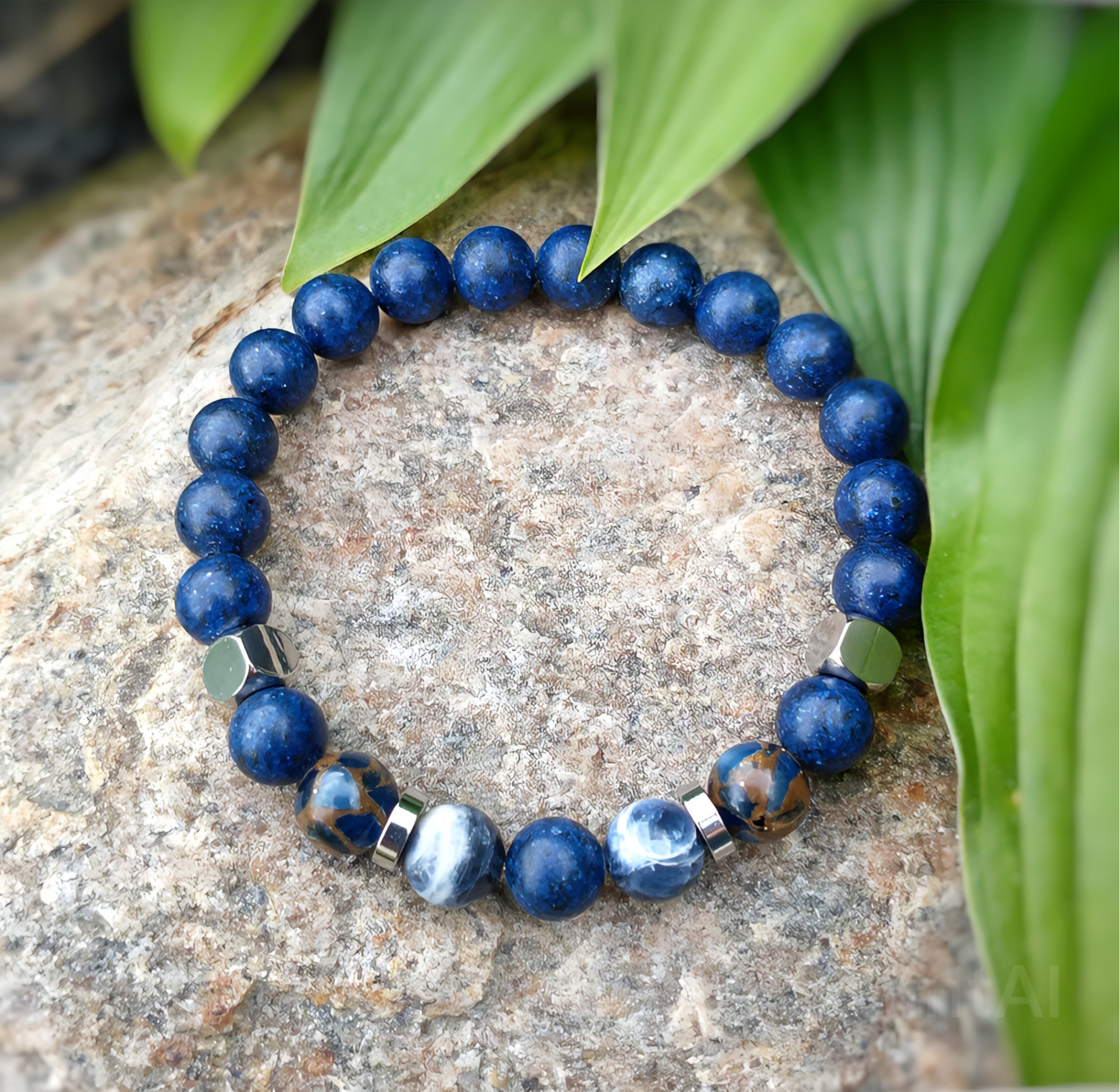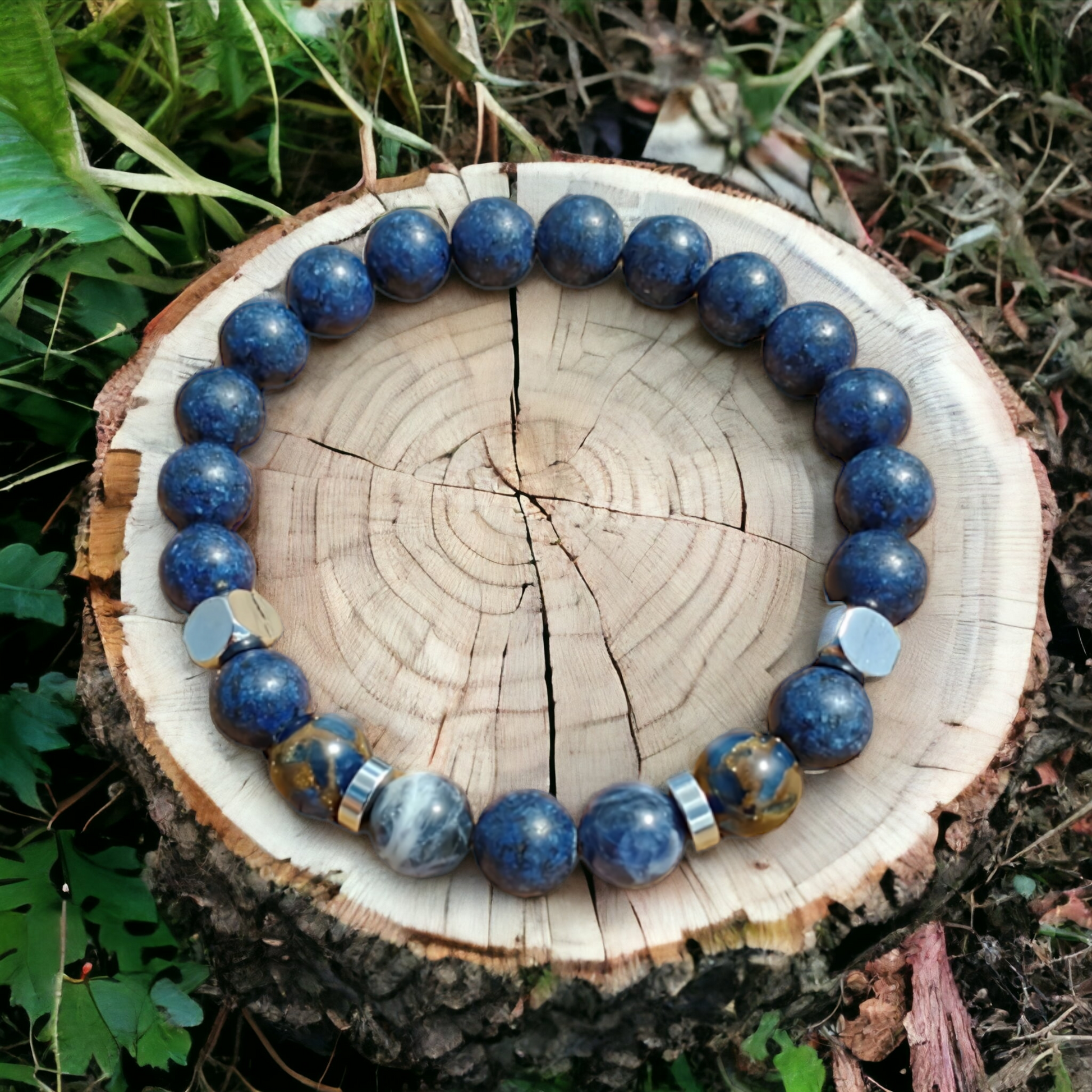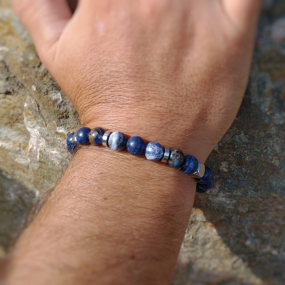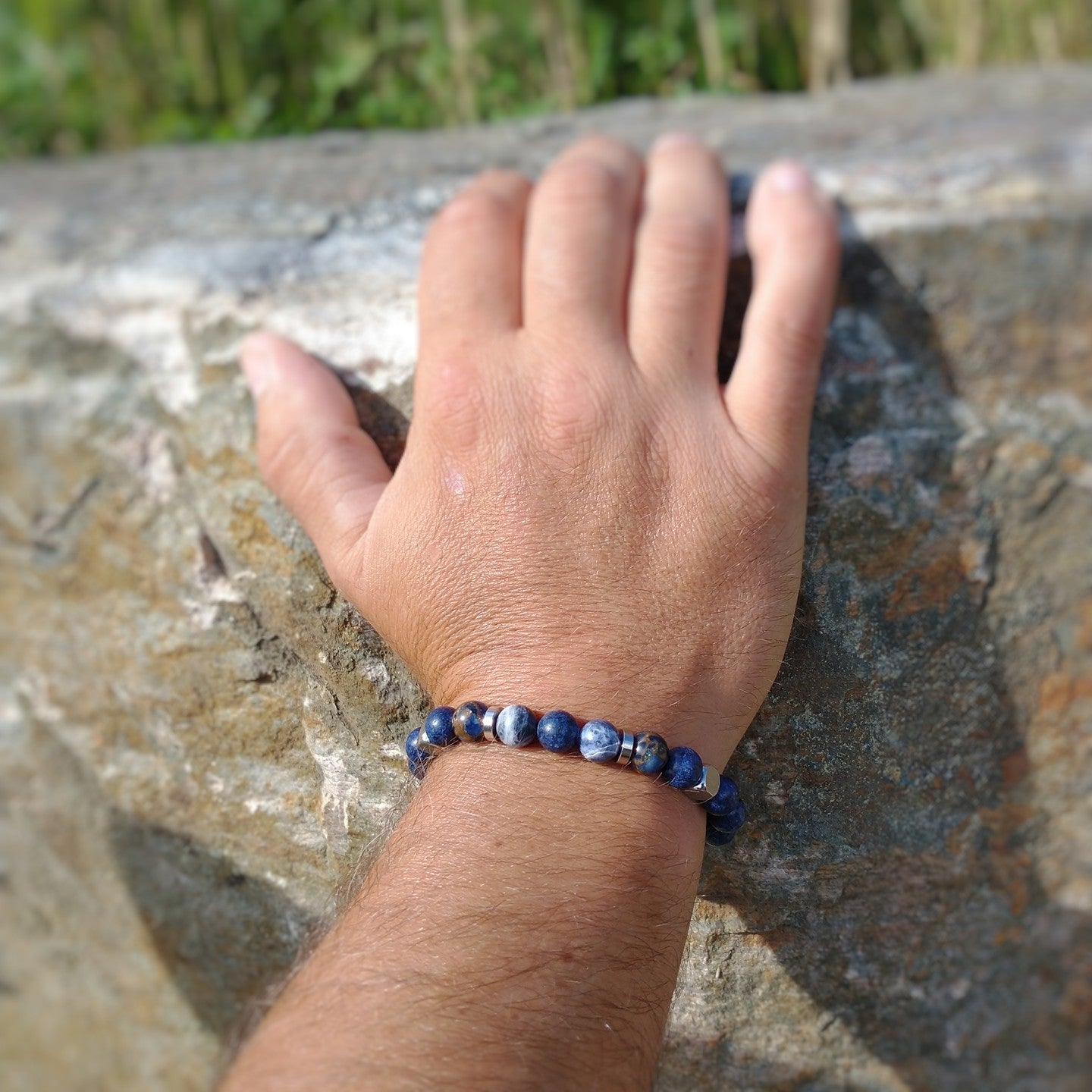 Voici le beau bracelet "Xavier", composé de pierre de jaspe, lapis lazuli et sodalite 8 mm. Il est décoré de jolies de rondelles et billes carré en acier inoxydable argent.